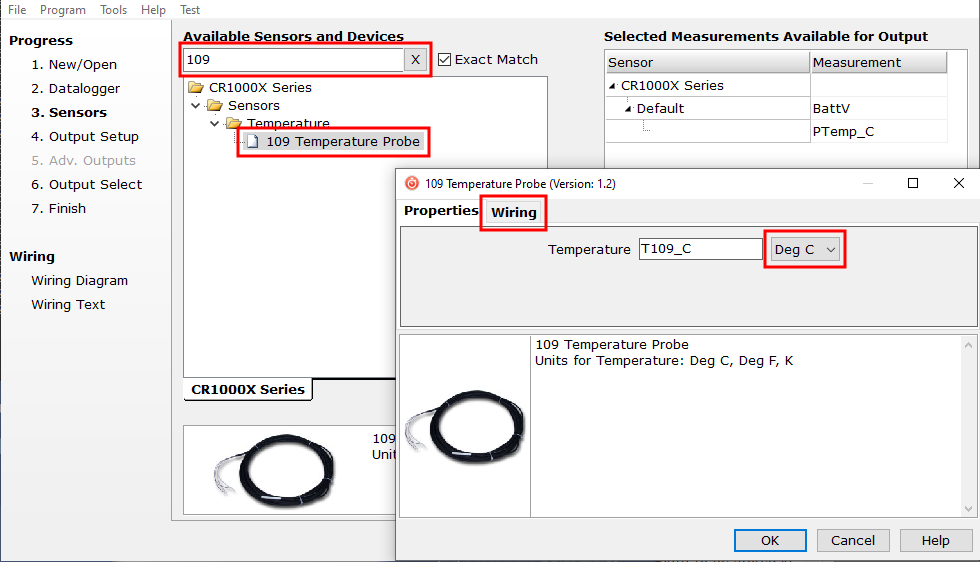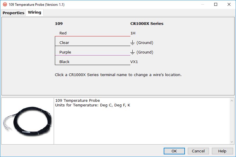 4. Click the Wiring tab to see how the sensor is to be wired to the data logger. Click OK after wiring the sensor.