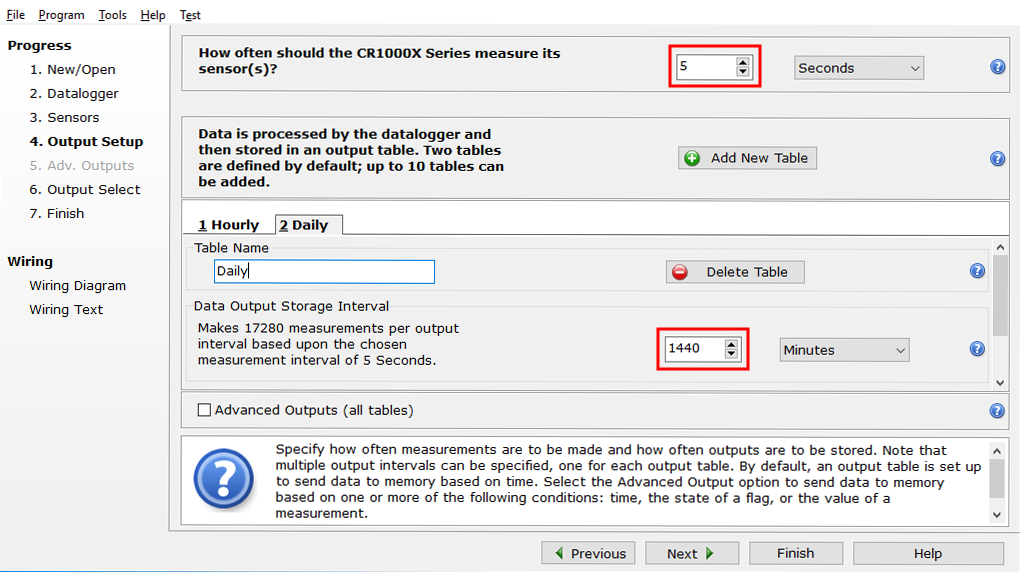 6. In Output Setup, type the scan rate, Data Output Storage Intervals, and meaningful table names.