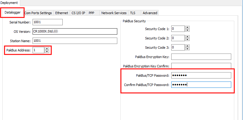 On the Datalogger tab, change the data logger PakBus Address and PakBus/TCP Password to match the values entered in the Konect PakBus Router setup. The PakBus/TCP Password will make the data logger authenticate any incoming or outgoing PakBus/TCP connection.