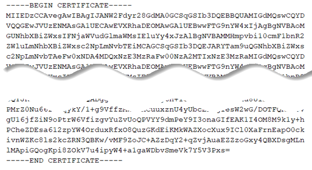 .PEMformat. The contents of a valid.PEMformatted certificate will look similar to the following when viewed as a text file. The----BEGIN CERTIFICATE-----header and-----END CERTIFICATE-----footer indicate that the key was generated in the correct format.