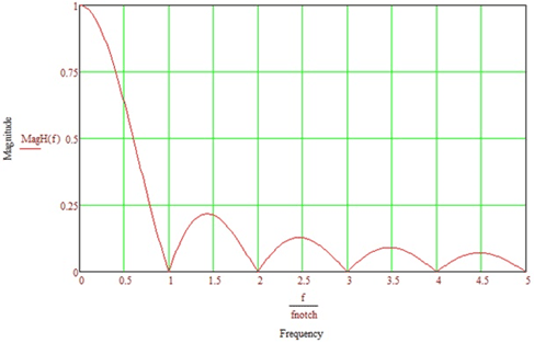 An adjustable filter is applied to analog measurements, reducing signal components at selected frequencies. The following figure shows the filter frequency response. Using the first notch frequency (fN1) parameter, users can select the placement of the filter notches. The first notch falls at the specified fN1, and subsequent notches fall at integer multiples of fN1. Commonly, fN1 is set at 50 or 60 Hz to filter 50 or 60 Hz signal components, reducing noise from ac power mains.