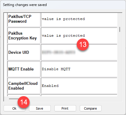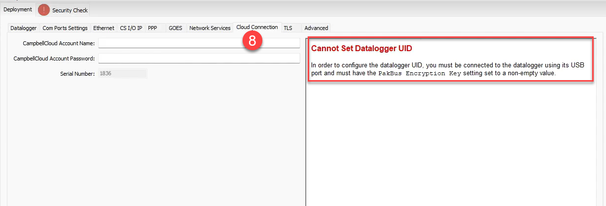 NOTE:If a PakBus Encryption Key is not set, Device Configuration Utility will prompt you to set one before obtaining a UID. To do this, navigate back to the Deployment tab, click Edit next to PakBus Encryption Key and enter a key. Once a PakBus Encryption Key is set, it will be required for users and other devices to communicate with the data logger. Be sure to record it for future reference. Click OK, then Apply and Confirm your setting changes. Finally, click OK on the resulting dialog box and return to Step 5.