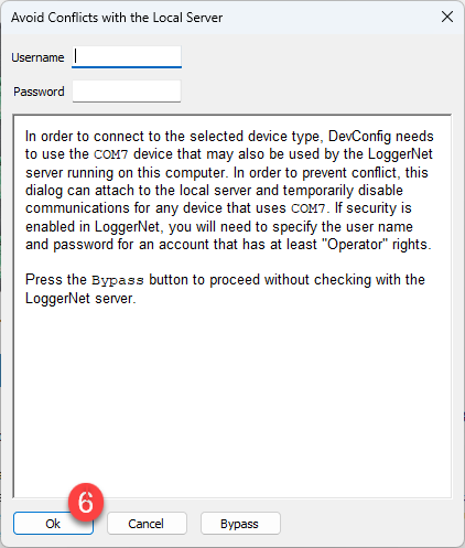 If Device Configuration Utility was opened from LoggerNet or PC400, a window opens titled Avoid Conflicts with the Local Server. Click OK.