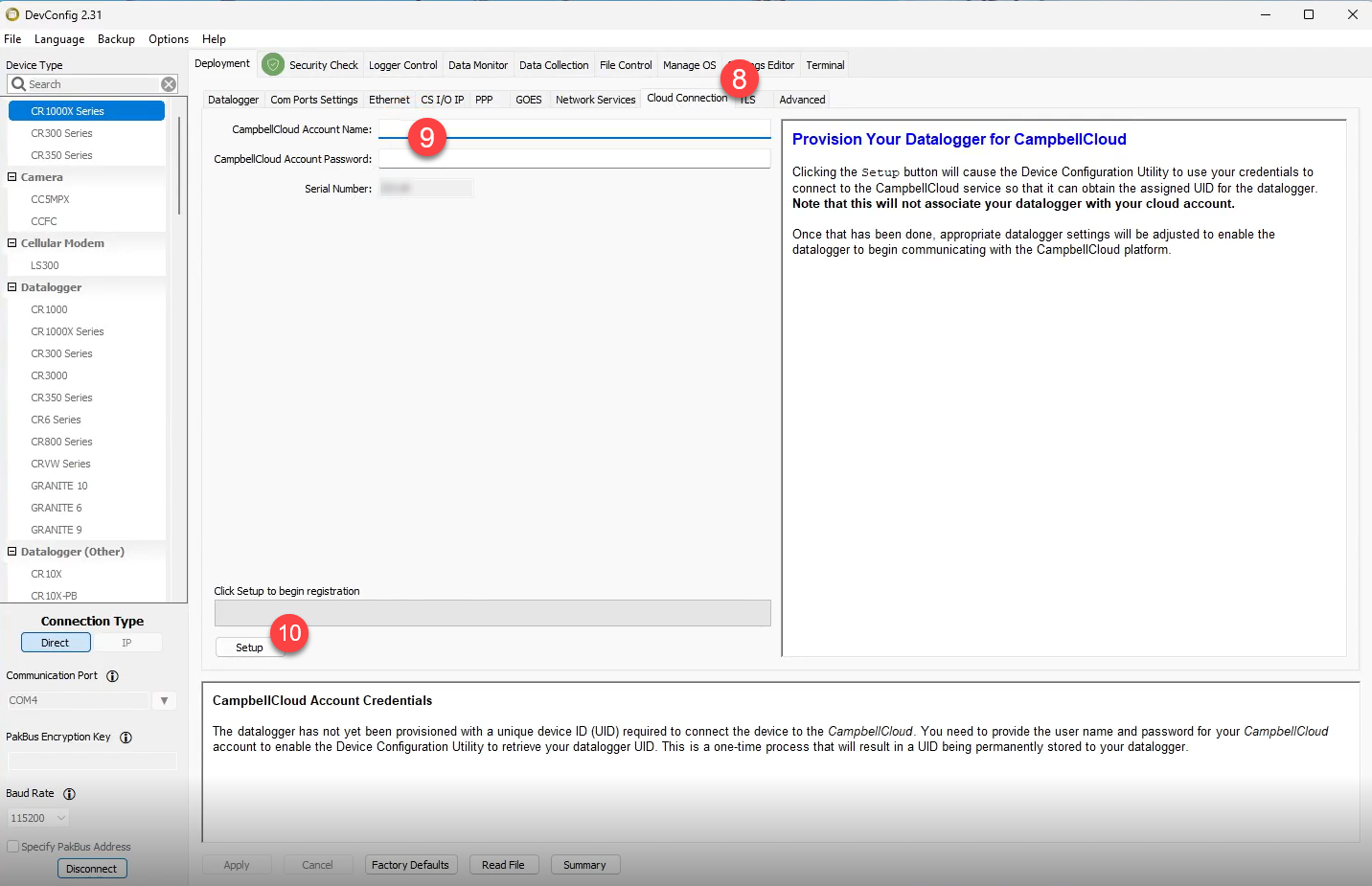 Device Configuration Utility will identify the PakBus address of the data logger and connect to it. Once connected to the data logger, Device Configuration Utility will open the Datalogger tab under Deployment.