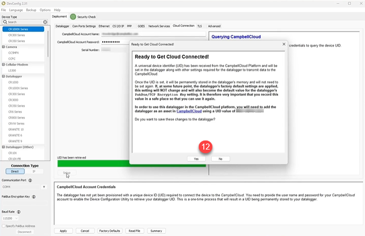 The data logger now has a UID assigned, enabling its use with CampbellCloud.