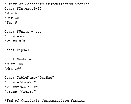 To set up Constant Customization, place the cursor on a blank line within the CRBasic Editor and choose Tools > Set Up Constant Customization Section. This will insert two comments into the program: