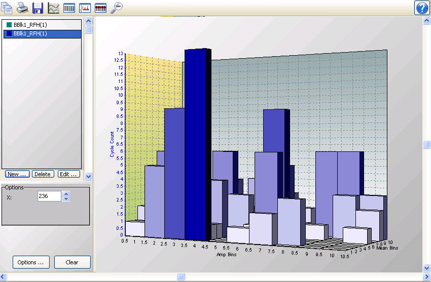 Additional rainflow histogram records can be added by pressing the New button. (These additional records can be from either the same rainflow histogram or a different rainflow histogram in your data file.) You can then choose which rainflow histogram record is being displayed by selecting it in the list.