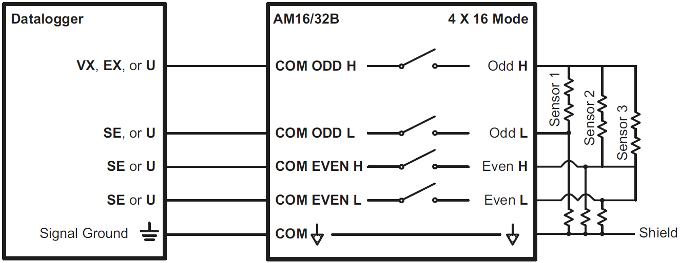 Typical half-bridge measurement connection shows a typical connection for half-bridge measurements, such as 107 temperature sensors. Using this method, a data logger can make up to 48 half-bridge measurements through a multiplexer. See AM16-32B Example B-5 CR6 107 temperature probe measurements.CR6 and Wiring for Campbell Scientific 107 temperature sensors CRBasic example for the program and wiring diagram, or use Short Cut to create the program.