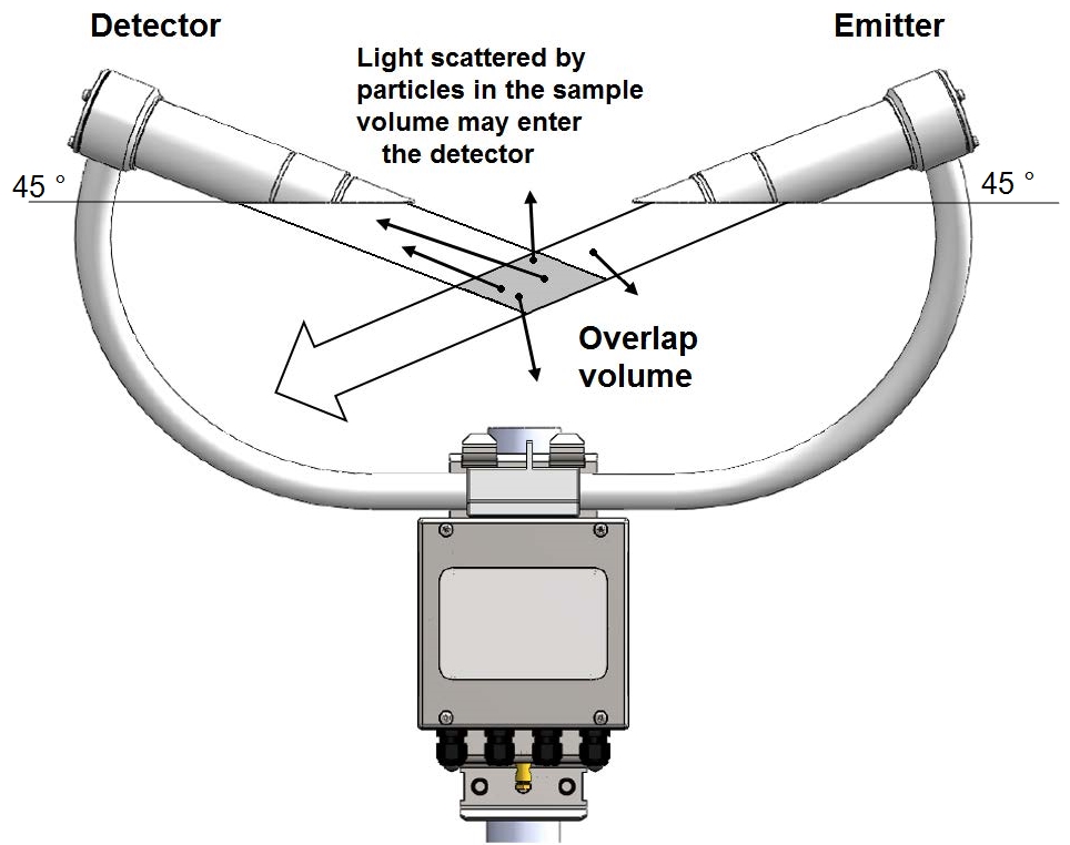 Particles in the sample volume scatter light in all directions, including into the detector. The emitter produces a beam of near infrared light pulsed at 1 kHz. A