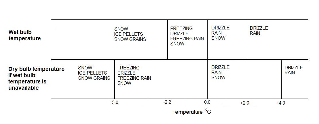 Possible precipitation types based on wet-bulb and dry-bulb temperatures shows how these temperatures are used to define possible precipitation