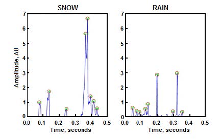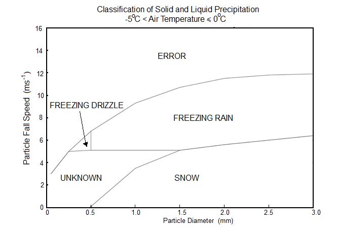 visibility. Weather type is identified through analysis of the amplitude and width of spikes in the avalanche photodiode (APD) signal, which corresponds to the particles of precipitation traversing the sample volume. The width of the spikes, which reflects the time taken for the particles to descend through the sample volume, serves as a proportional indicator of their fall speed (see Signals from large, slow-falling snowflakes and smaller, faster raindrops).