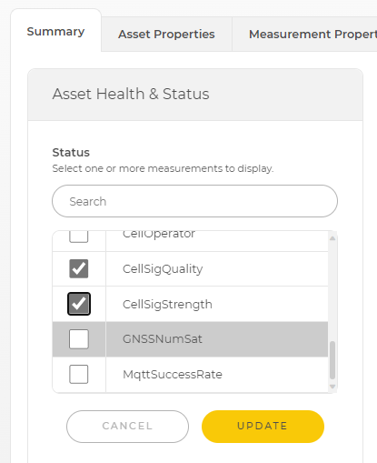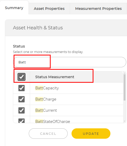Every field in the status table is shown. Select the fields you want to have displayed on the summary tab by clicking the box to the left of each measurement. Click Status Measurement at the top of the list to select all status measurements. Use the Filter box at the top to filter the list of status measurements. With an active filter, clicking Status Measurement will select only those measurements in the current filtered list. After selecting the desired status measurements, click UPDATE to save changes.