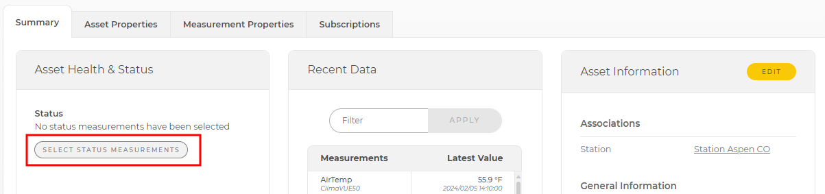 On the Summary tab, the first column is labeled Asset Health and Status. Currently, no status measurements are being displayed. Click SELECT STATUS MEASUREMENTS.