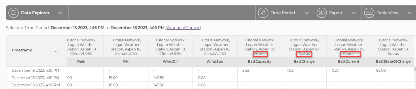 In a Data Explorer table, columns for the Status table information are added to the right of sensor measurements.