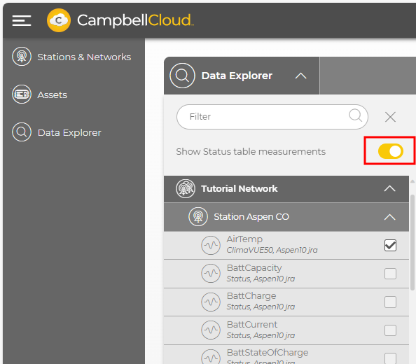 Select Data Explorer from the applications menu and then select the network and station to display. In this case, Tutorial Network, followed by Station Aspen CO. To view Status data, click the funnel next to the network name.