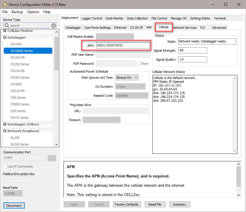 On the Cellular tab, enter the APN provided by your cellular provider.