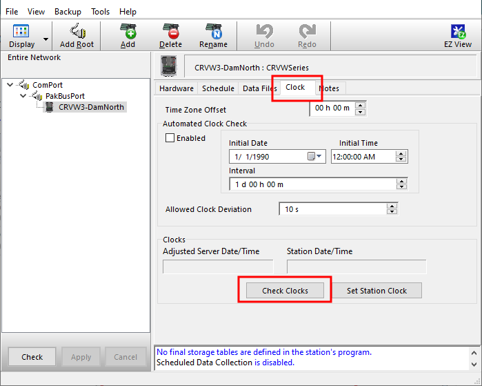 Click Check Clocks button to instruct LoggerNet to send a clock check command through the base station to the destination station. If the radio link is working, the current date and time should show up in the Adjusted Server Date/Time and Station Date/Time boxes within a few seconds.