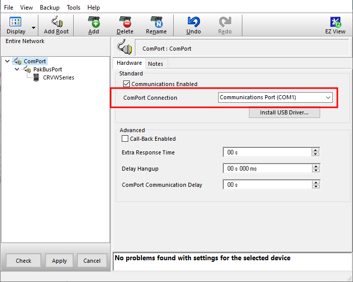 On the Hardware tab, use the ComPort Connection drop-down selection box select the serial port to which the base radio is connected on your LoggerNet computer.