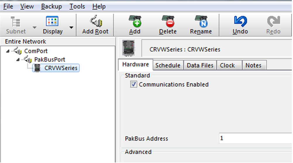 Adding additional devices to your network map does not require re-entering ComPort, IPPort, or PakBusPort. Simply click on the existing PakBusPort device and click Add. Choose CRVWSeries from the list of data loggers and click Close. You will now have another device on the network map. It is recommended you rename devices as you add them to avoid any confusion.
