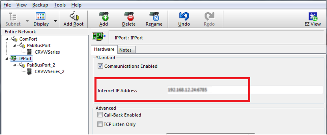 On the Hardware tab, set the PakBus Address value to match the value that was configured into the device with Device Configuration Utility or with the Network Planner.
