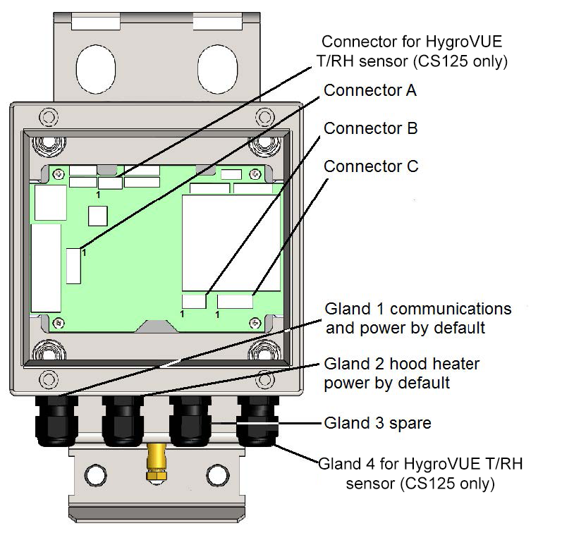 To use these connections, either use the cable gland connected to the hood heater power or, if the hood heater is also required, use different cables to those supplied. Contact Campbell Scientific for cable choice assistance.