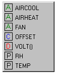 The variable list is sorted by variable type and then alphabetically by name. In the list above, the first green A denotes that the variable AIRCOOL is set up as an Alias.