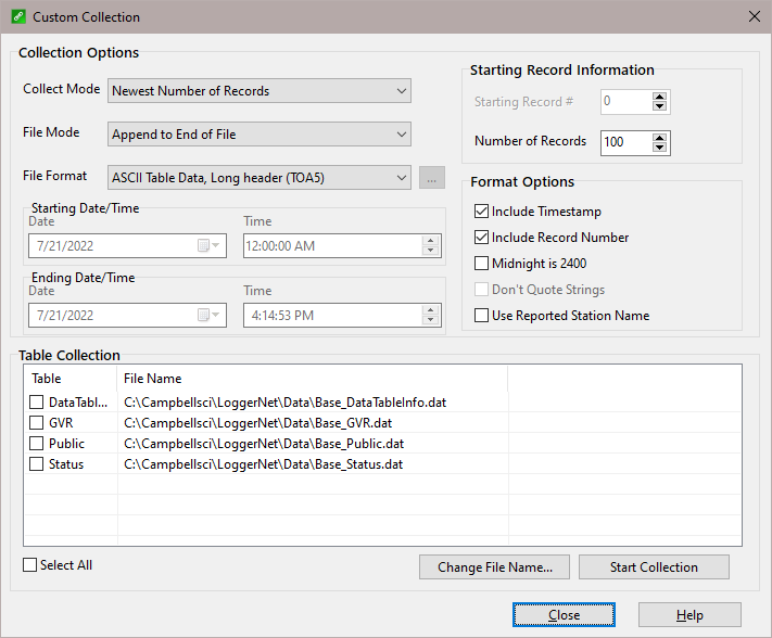 NOTE: While retrieving data from the datalogger using Custom Collection, scheduled data collection will be suspended. The default data file names for custom collection are separate from the files for scheduled collection data and by default are placed in a Data directory under the LoggerNet directory.