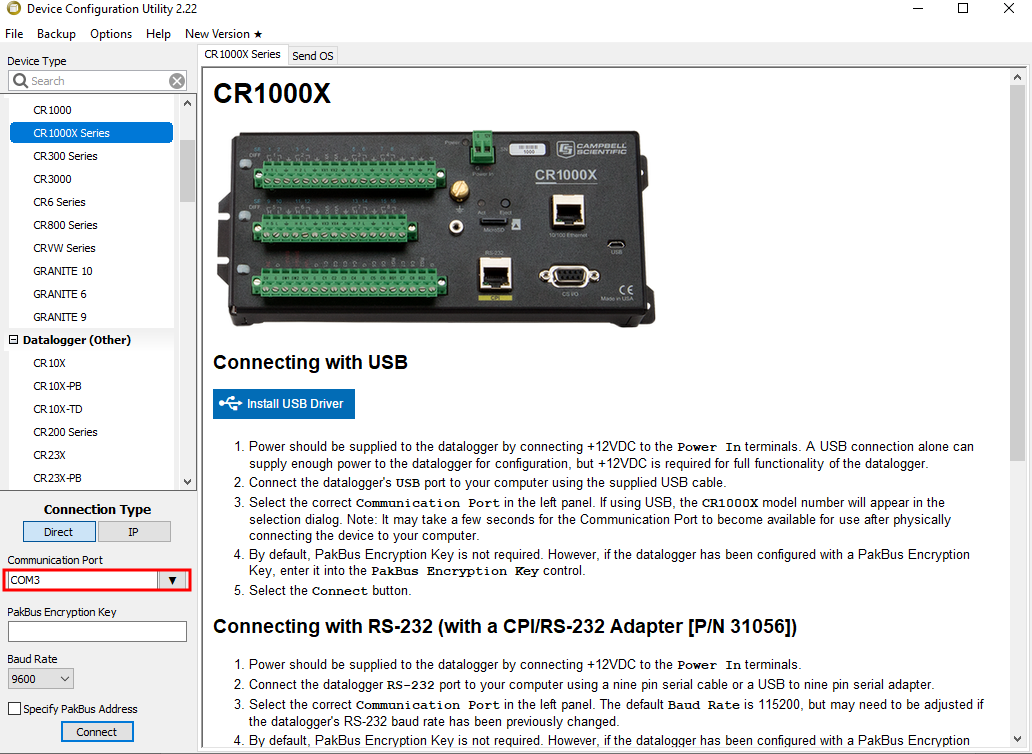 Under Device Type, type the data logger model and double-click on the model type. This example uses a CR1000X directly connected to the computer USB port.