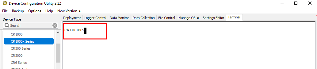 Press Enter until the data logger responds with the data logger (CR1000X>) prompt.