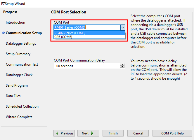 9. Accept the default value of 00 seconds in the COM Port Communication Delay - this box is used to allow time for hardware devices to "wake up" and negotiate a communications link. Click Next.