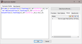 Once a data value has been aliased, the alias can be used in place of the data value in the expression as shown below. The alias is inserted into the expression by typing it directly, double-clicking on the alias, or right-clicking on the alias and selecting Insert alias_name into expression.