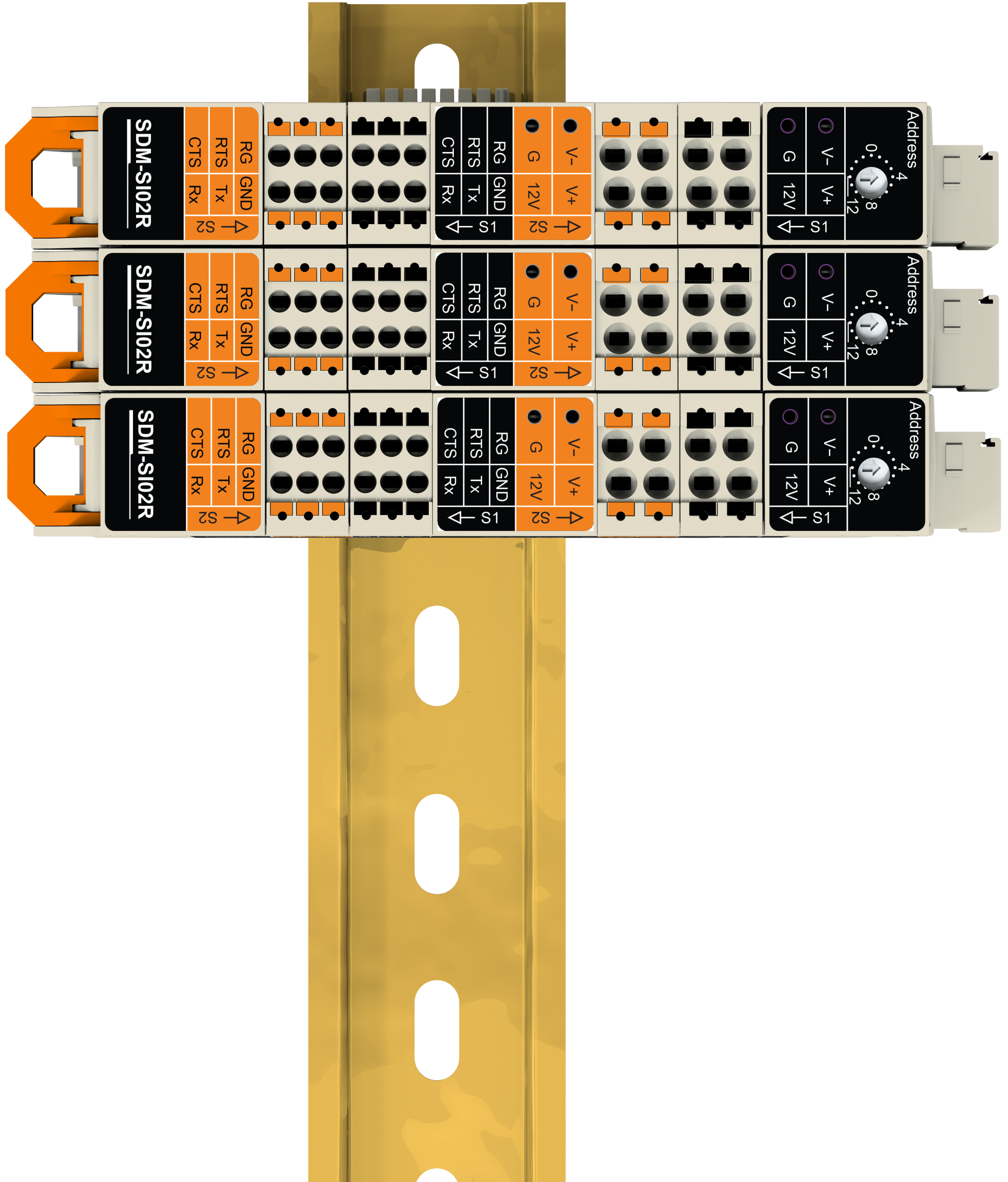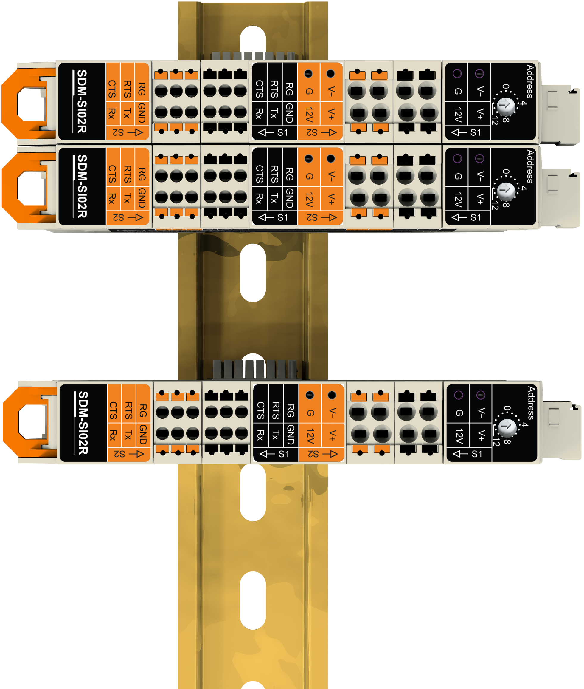 All SDM‑SIO2Rs that are connected on the DIN rail will share a common bus.