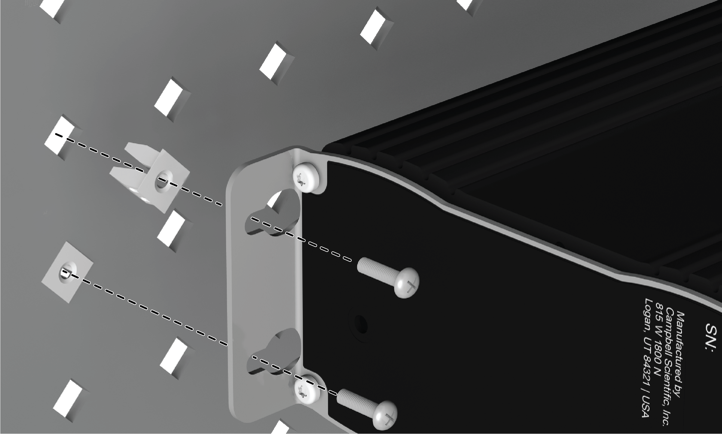 Campbell Scientific data loggers and GRANITE Measurement Module brackets have mounting holes through which small screws are inserted into nylon anchors in an enclosure backplate.