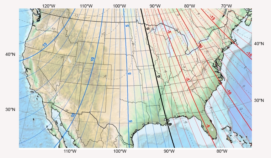 The orientation of the WindSonic4 north arrow markers is found by reading a magnetic compass and applying the site-specific correction for magnetic declination; where the magnetic declination is the number of degrees between true north and magnetic north. Obtain the magnetic declination for a specific site from a USGS map, local airport, or through a NOAA web calculator (Online magnetic declination calculator). A general map showing magnetic declination for the Conterminous United States is shown in Magnetic declination for the conterminous United States (2015).